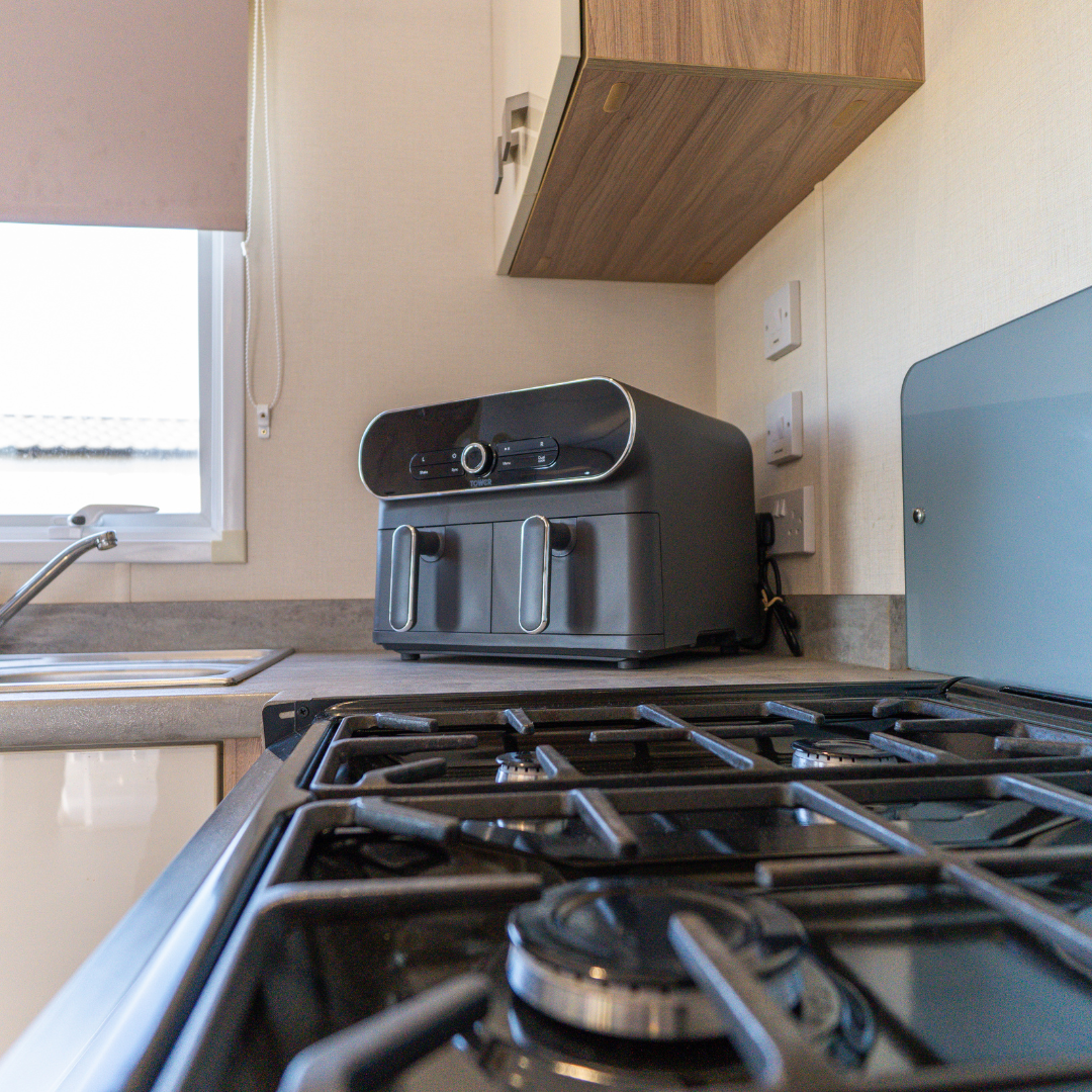 The fully equipped kitchen includes everything you need for a self-catered break. The home features two bedrooms – one double and one twin – with additional sleeping space available on the pull-out sofa bed in the lounge, comfortably accommodating up to six guests.